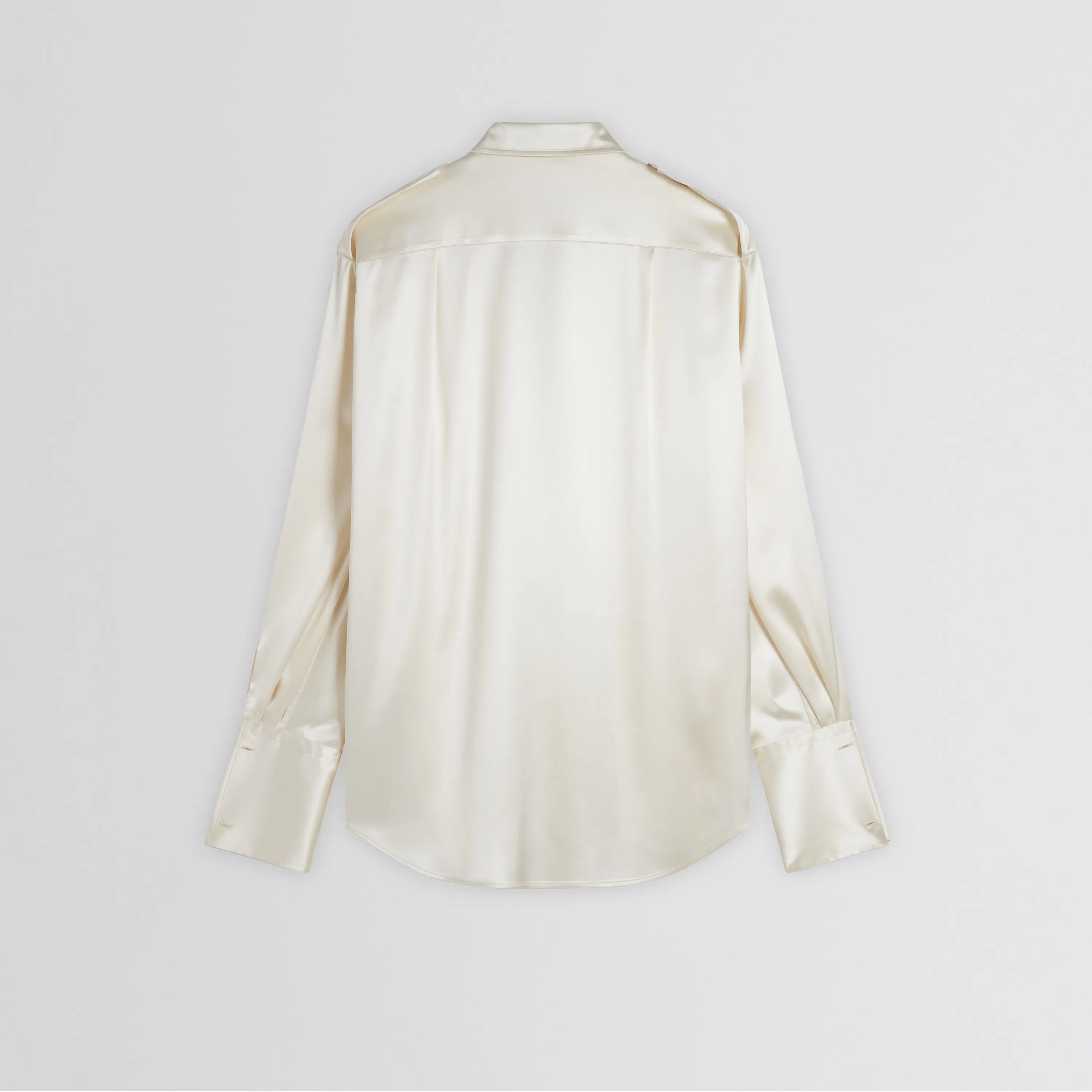 Liquid utility shirt in cream silk satin. Long sleeves with button-fastening tabs on the shoulders. Soft and comfortable, the stretch silk has a light sheen.