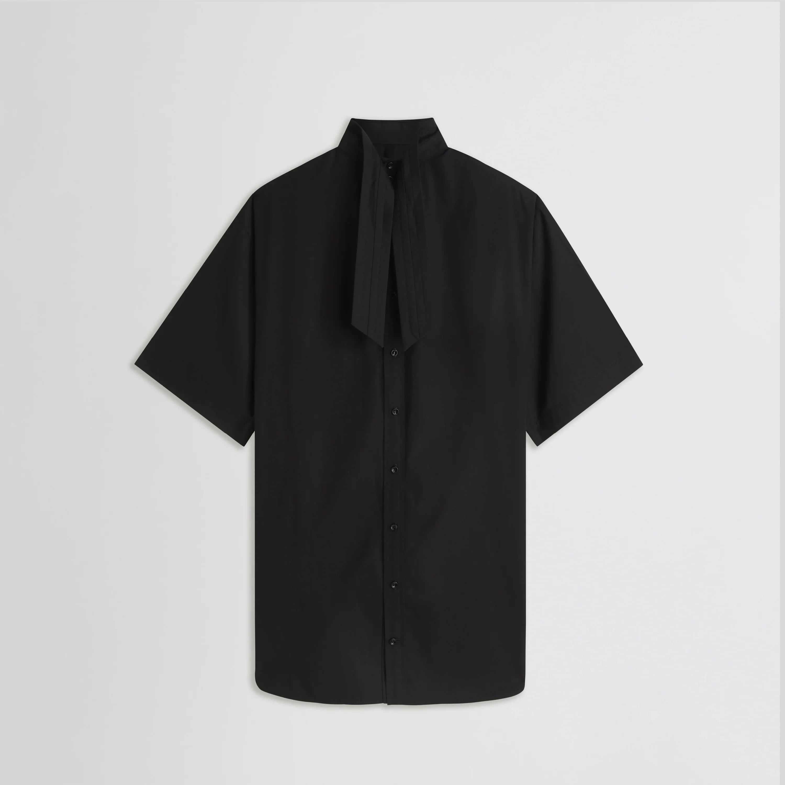 Tie neck, back-fastening shirt in black cotton. Cut for an eased fit and added volume at the back, the top has wide, elbow-length sleeves, a high neck, and button fastening placket.